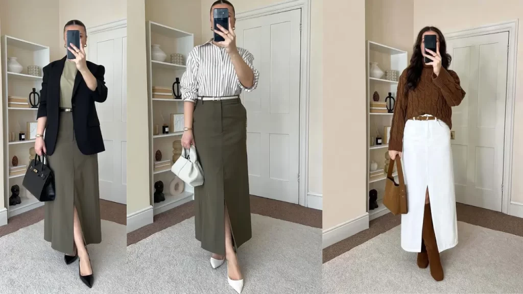 Para o escritório, opte por peças estruturadas em cores sólidas. Um vestido midi em jersey de qualidade com um blazer matching cria um visual impecável que transmite seriedade sem ser masculino.